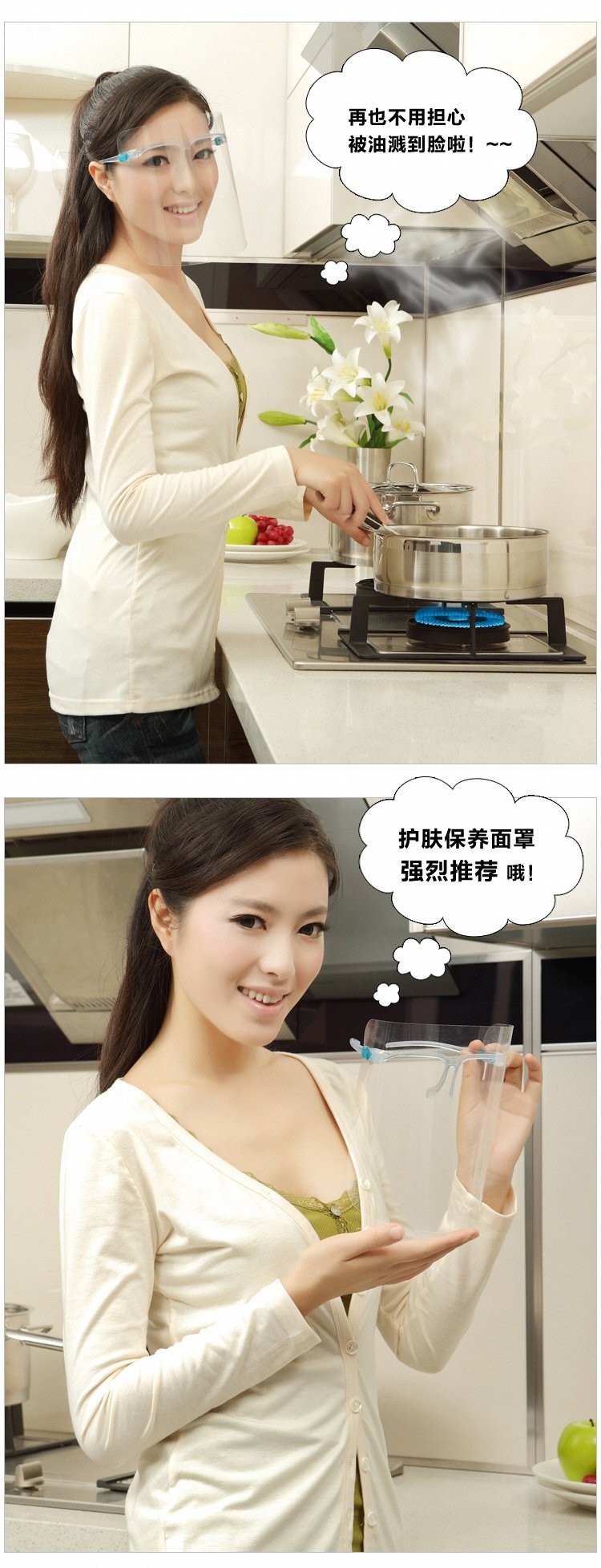 Empezamos protegiendo la cara, y es que ¡estamos locos! cocinamos a cuerpo, hacemos frente a los aceites chispeantes sin protegernos lo más mínimo! Yo no se si este invento es chino, pero podría serlo, a lo mejor este es el secreto de su -cliché coming- cutis perfecto. Es la máscara para cocinar!!